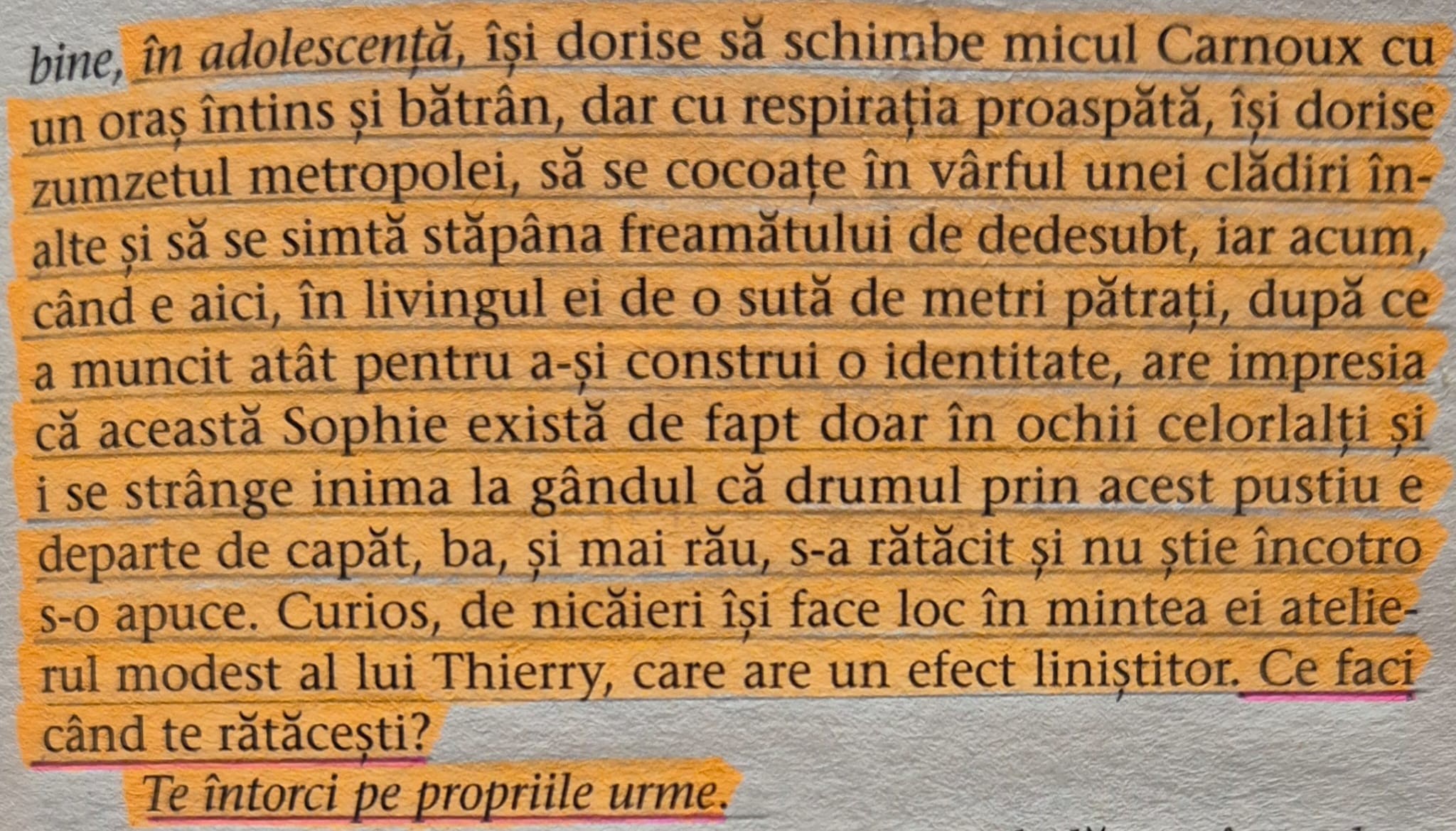 3. Drama dezrădăcinaților. Legătura dintre cele două planuri este făcută de Sophie care se îndrăgostește de un imigrant român. În capitolul 33 al cărții o să înțelegeți de ce jurnalista a fost atrasă de povestea fetei dispărute din România. Deși ea are cetățenie franceză, părinții ei s-au refugiat în Franța după Masacrul de la Oran. Pe 5 iulie 1962, când Algeria și-a câștigat independența, arabii aproape au exterminat populația pieds noirs din cartierul Oran. (Personalități pieds noirs: Claudia Cardinale, Albert Camus, Yves Saint- Laurent, Daniel Auteuil, Jaques Derrida.) Trăiește în Franța, dar rădăcinile ei sunt fragile. Dragă cititorule, dacă în drumurile tale prin țară o vei întâlni vreodată pe Sophie, în loc să te miri că a ales România, întreabă-te de ce a făcut-o.