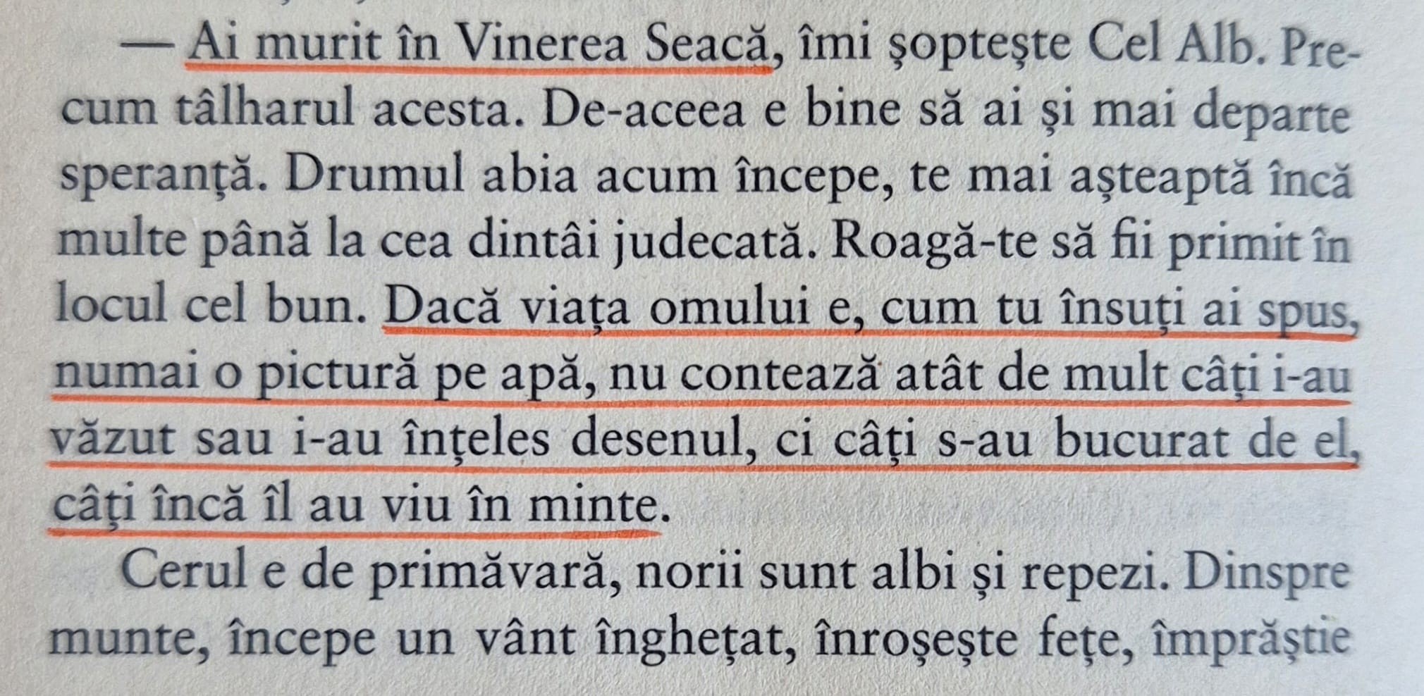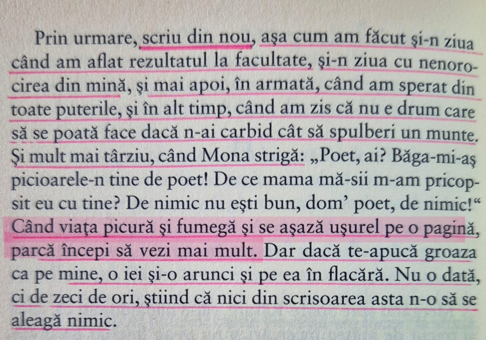 „Dragostea nu va pieri niciodată. Și nu a pierit. A trecut limpede prin vremea Monei, a tunelului, a Bețivei. E și acum cu mine. Nu mă ridic să arunc în foc, așa cum am făcut cu scrisoarea pe care am scris-o mai sus, și foile astea de abur. Sunt mărturie. Poate nu-s de folos pentru mine, dar acum, la capătul capătului, mă gândesc că dragostea e binele. Iar binele meu, cât am trăit pe lume, ai fost tu, Helga.”